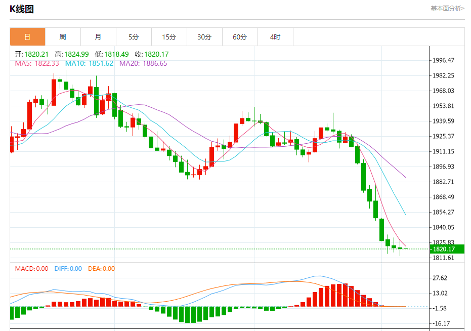 周五盘中,现货黄金报1814.12,跌幅0.38%。