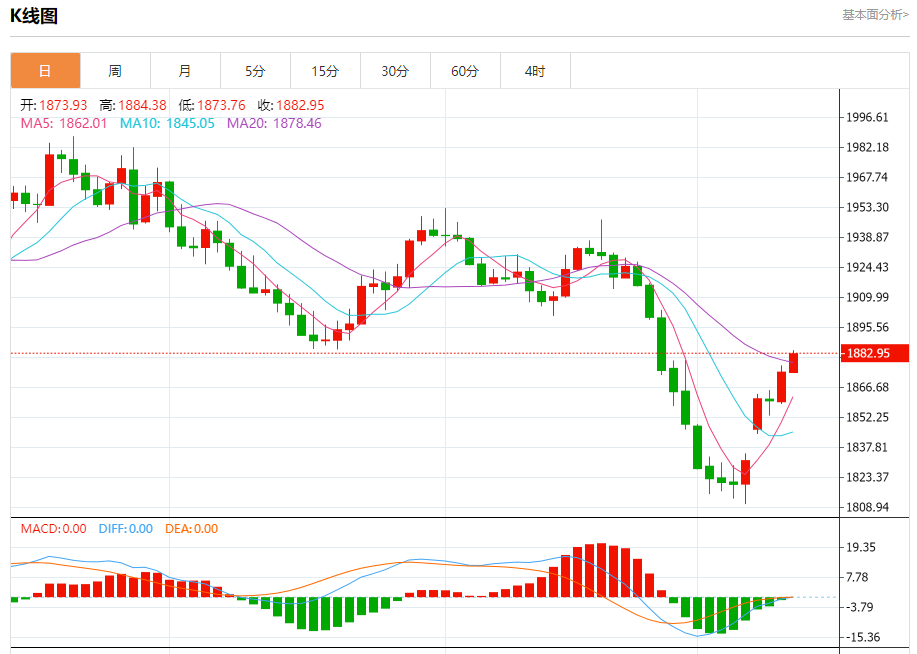 周四盘中,现货黄金报1883.50,涨幅0.50%。