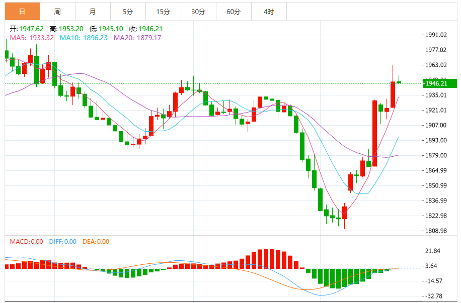 现货黄金周三收市大涨24.53美元,涨幅1.28%,报1947.55美元/盎司。