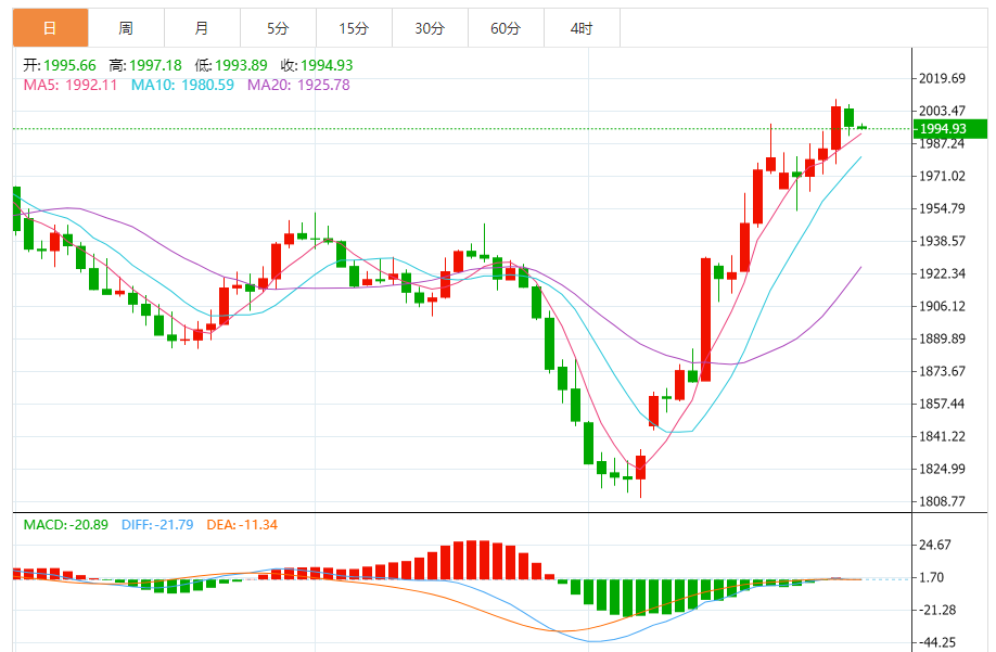 综合来看,黄金日内短期操作思路上建议回调做多为主,反弹做空为辅,上方短期重点关注2008-2013一线阻力,下方短期重点关注1985-1980一线支撑。