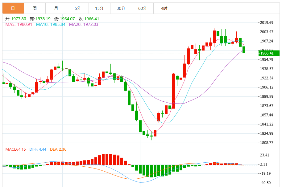 金价在未能守住1970美元/盎司后,目标将瞄准21日简单移动平均线(SMA)1966美元/盎司。