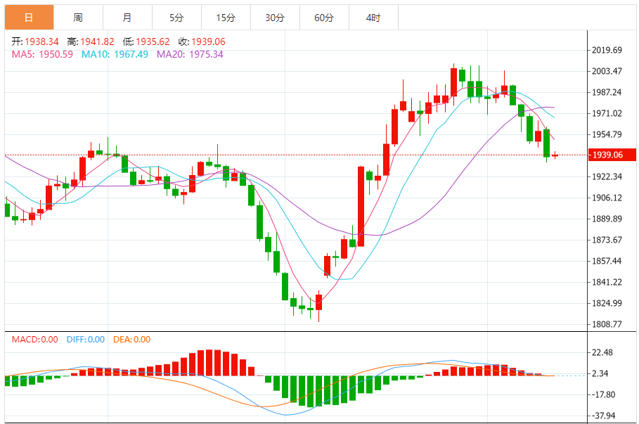 现货黄金上周五收市大跌20.38美元,跌幅1.04%,收报1938.07美元/盎司。
