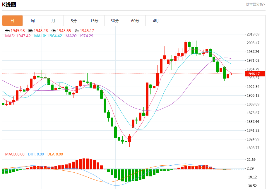 周二盘中,现货黄金报1945.32,跌幅0.03%。