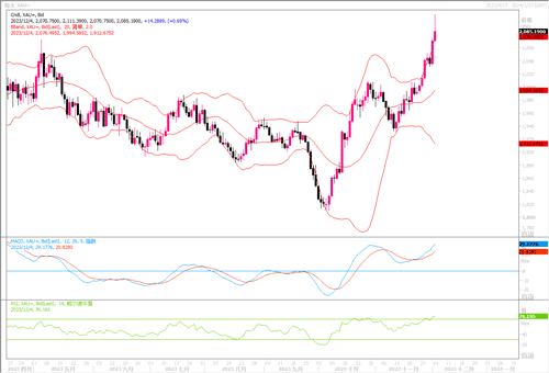 技术层面上, 日线级别macd金叉放量运行,RSI向超买区域挺进,多头格局明显。而根据日线走势看:短期支撑2045-52一线,其次是2030附近。上行方面在2100关口预料多空将有一番激烈的争夺。