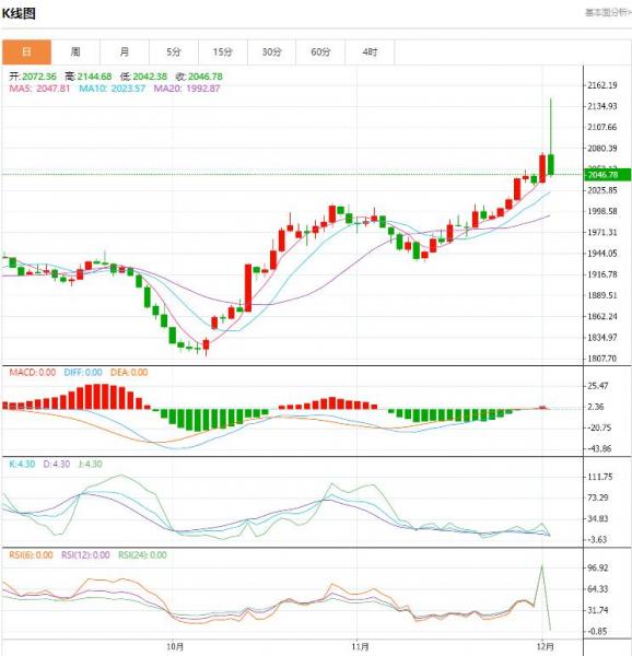 周一(12月4日),国际黄金回吐亚盘的全部涨幅,目前转跌回落至2070美元下方,今日稍早金价一度冲破2100美元,刷新历史高位至2144附近,不过这一疯狂的升势目前回归平静,市场本周聚焦美国非农数据。
