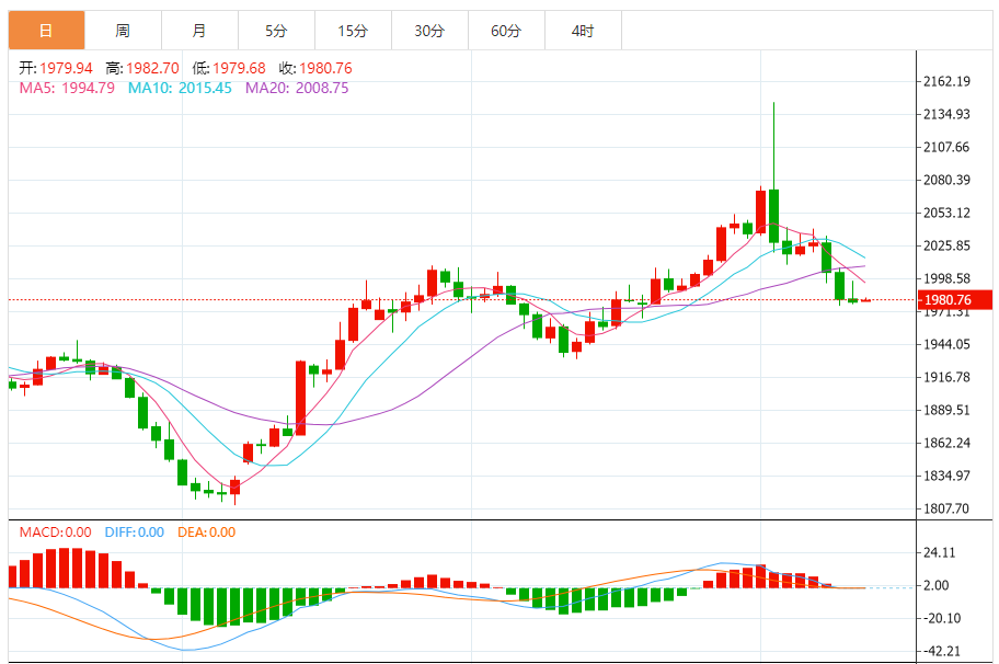 黄金昨日承压2007关口下方不断弱势震荡下行破底,晚间美盘在围绕1990关口稍做停留后迎来空头加速下行破底,最终金价向下击穿1980关口到达1975附近弱势收盘,黄金日线图来看,日K之中随机指标均线MA5-MA10死叉向下,MACD继续打出较长的绿色能量柱,KDJ在20零抽线附近纯化,综合各项指标来看,结构上主空信号。