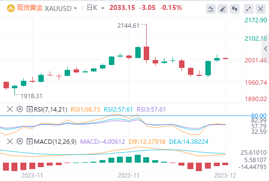 周四(12月14日),金价周四触及10日高位2047.49美元/盎司,收盘上涨0.5%报2,036.69美元/盎司。
