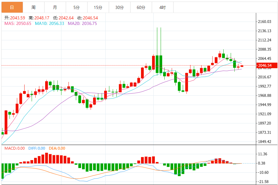 黄金日线十字星K线整理收盘,相对于前一日的放量下挫,昨日区间稍有收敛,最高反弹2050.80承压,回测2036后陷入震荡收尾,前一日的低点2030未能击穿延续弱势。局部进入震荡修正。今日周线收官,从昨日的空间和力度来看,今日周线收官之作也大概率是震荡收尾。4小时图一波修正后没能二次破低下行,十字K线横向整理收盘。