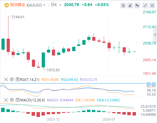 周二,现货黄金在2030关口附近横盘震荡,最终收涨0.11%,报2030.34美元/盎司。截至目前,黄金报价2030.79。