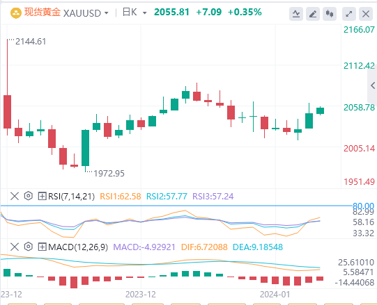 黄金目前位于2055.81,显示出看涨势头。它的交易价格高于两条关键移动平均线,即50日均线2016.29和200日均线1963.39,表明走强。