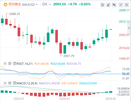 黄金/美元连续第四日上扬,目前交投于2055美元附近。技术上,该货币对有进一步升向1月高点2078.99美元的空间。在日图上,金价自持平的20日SMA均线大幅反弹,而长期均线依然位于其下。RSI强势上升突破中线,动能指标滞后,徘徊于中性水平附近。