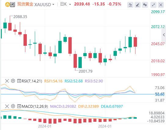 金价周五下跌,美元和美国公债收益率在强劲的1月非农就业报告公布后大幅上涨,这给美联储是否可能很快开始降息带来了一些不确定性。现货金下跌0.8%,至每盎司2038.59美元,但本周上涨近1%,且自年初以来一直保持在2000美元的关键水平之上。美国期金GCcv1下跌0.8%,结算价报2053.7美元。