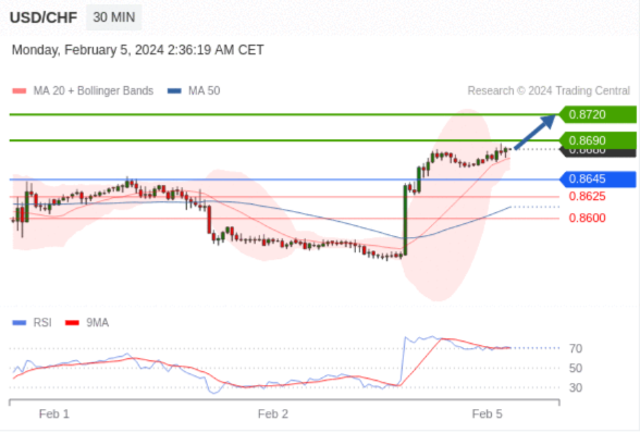 在 0.8645 之上,看涨,目标价位为 0.8690 ,然后为 0.8720 。