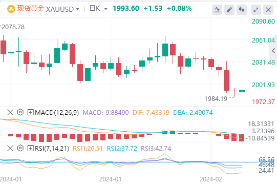 现货黄金在1990美元关口附近徘徊,最终收跌0.04%,报1992.33美元/盎司。截至目前,黄金报价1993.60。