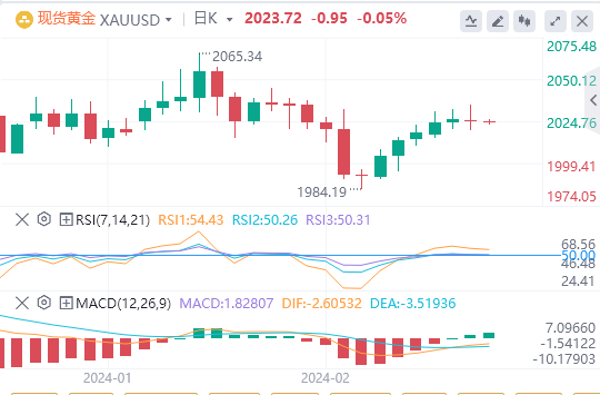 周四,受美元先涨后跌的影响,现货黄金呈现倒V形走势,最终收跌0.08%,报2024.4美元/盎司,止步日线五连阳。截至目前,黄金报价2023.72。