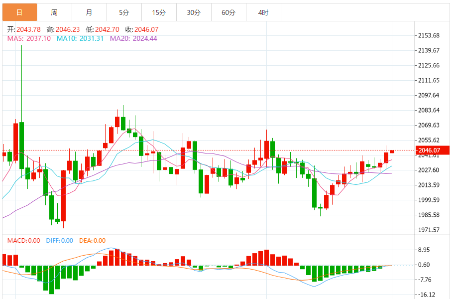 周五(3月1日),现货黄金延续日内反弹走势,目前金价交投在2046美元/盎司附近。