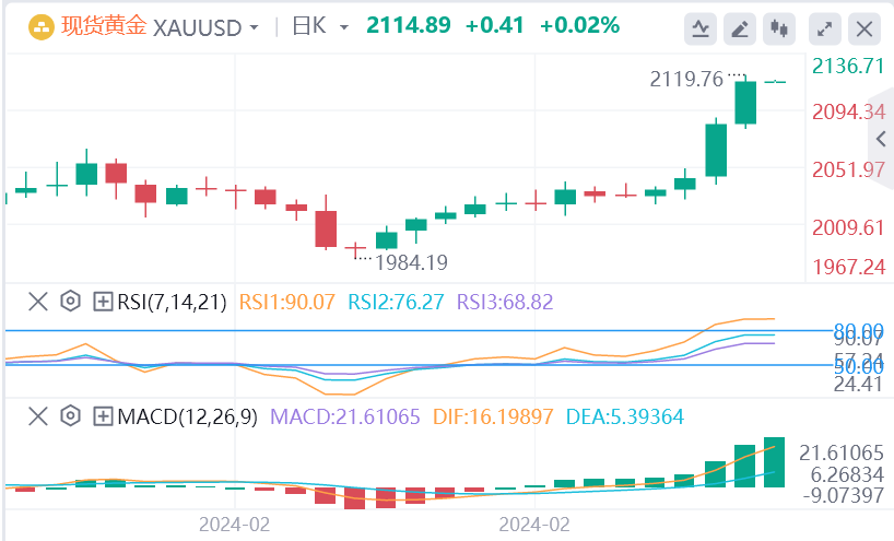 日图显示,金价压迫盘中高点2118美元,接近在12月录得的历史高点2,134.57美元。日图技术指标几乎直线上升,位于超买区域,没有上涨动能枯竭迹象。与此同时,该货币对比目前看涨的20SMA均线高出约90美元,该均线上升,也高于看涨的更长期均线。