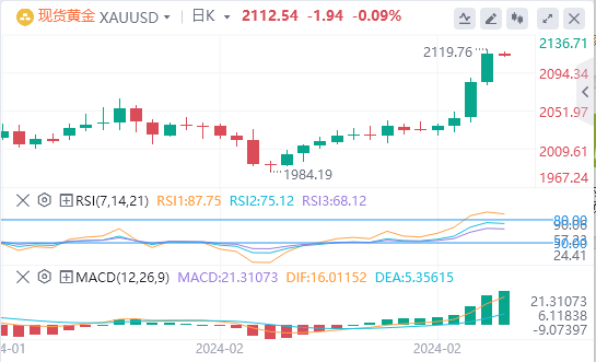 受降息预期升温和美元指数走弱影响,现货黄金上破2115美元/盎司,续刷2023年12月以来新高,日内大涨约30美元,最终收涨1.58%,报2115.8美元/盎司;截至目前,黄金报价2112.54。
