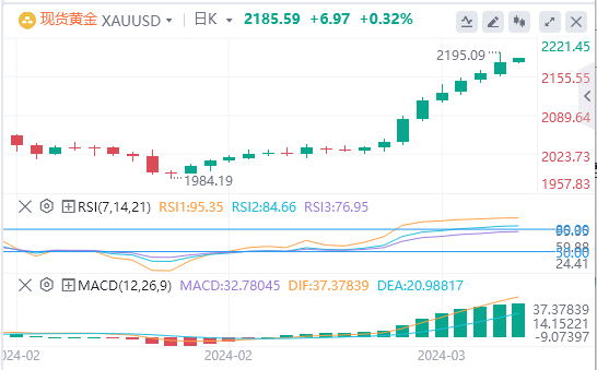 上周五,因美国非农报告显示失业率意外升至3.9%,现货黄金美盘大幅拉升,一度站上2195关口,但未能站稳,最终收涨0.89%,报2179.16美元/盎司;截至目前,黄金报价2185.59。