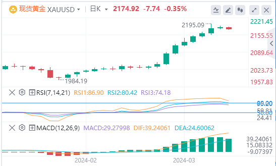 金价短期技术前景变化不大,由于日图RSI指标超买,金价可能出现调整。不过下一个方向性行情依然取决于美国通胀数据。若美国通胀数据意外下行,可能推升金价至历史高点2195美元,金价必须持续性突破2200美元才能瞄准2250美元的心理水平。
