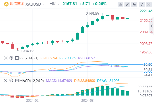 从日线图上观察,金价已形成潜在的"看涨三角旗形"形态,日线收盘价若高于下降趋势线阻力位2174美元,将确认该看涨延续形态。如果收于周二高点2,185美元上方,则将再次打开测试历史高点2,195美元的大门。下一个关键上行目标是2200美元门槛和2250美元心理价位。14天相对强弱指数(RSI)在70.00附近的超买区域徘徊,表明还有新的上涨空间。
