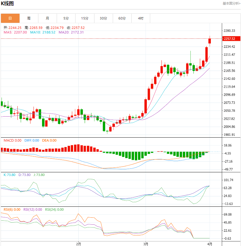 周一(4月1日),现货黄金价格持续强劲反弹,一度创下历史新高至2265美元/盎司,比上周四收盘价上涨约32美元,上周五黄金市场休市。