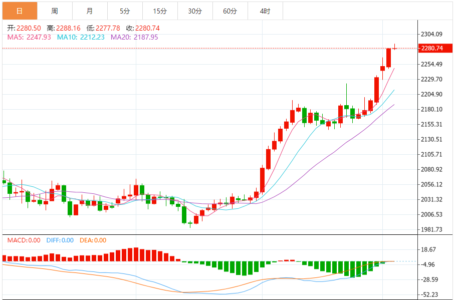 现货黄金周二收盘暴涨29.98美元,涨幅1.33%,收报2280.47美元/盎司。