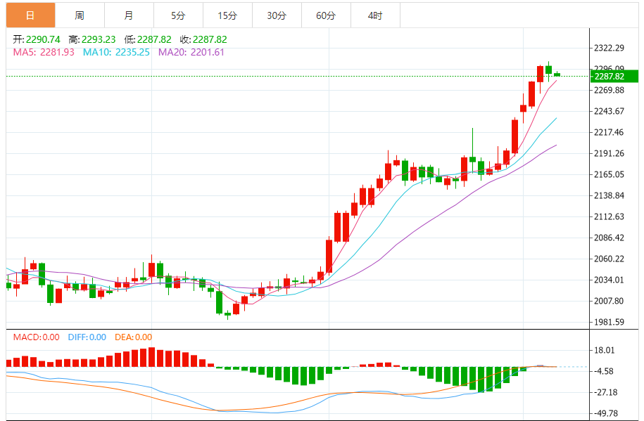 现货黄金周四收盘下跌9.21美元,跌幅0.4%,报2290.08美元/盎司。