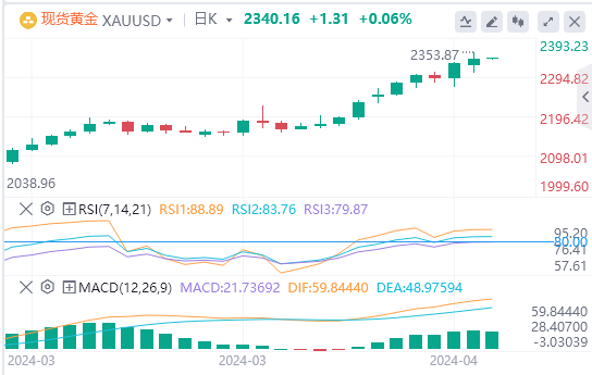 黄金在周一再创历史新高,自今年年初以来已升值超过12%,对于传统上被视为保守资产的黄金来说,这个表现令人印象深刻。从技术面来看,4小时级别,前期一波上涨行情到达2330,随后在该水平附近形成盘整区间。周一这个区间又扩大至2353.85。预计价格将先技术性回调至2330,然后可能继续上涨至2380.33,这是一个局部目标。MACD指标的信号线远高于零轴且指向上行,支持了这一看看涨前景。