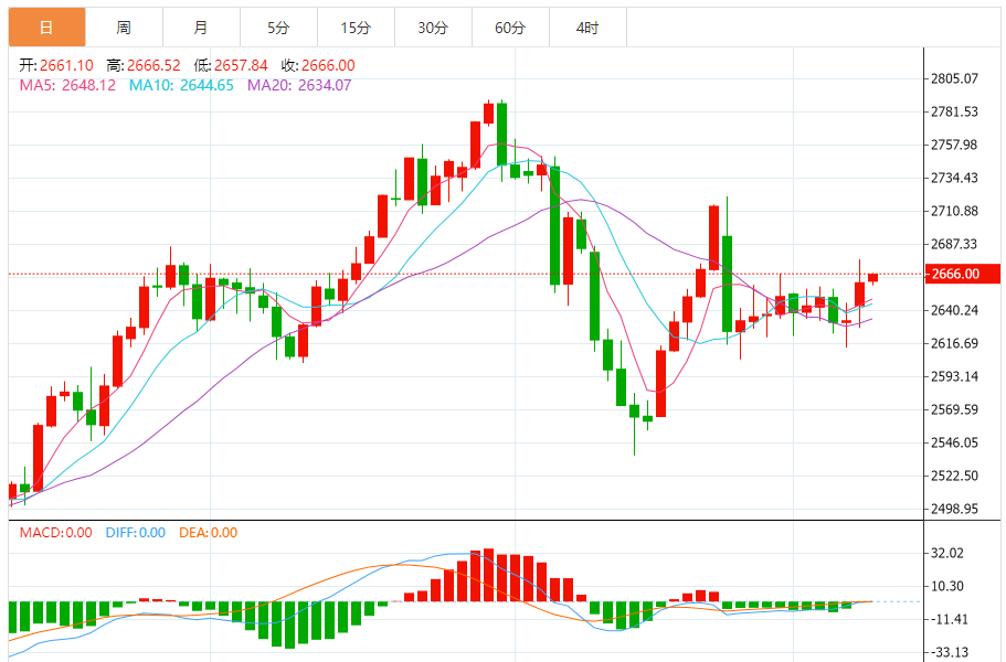日线级别:周一(12月9日)日线收出一根饱满大阳线,且突破此前高点2650强力放量,周线也是光头饱满大阳,显示多头力量较强。日均线已开始拐头向上,整体走势偏强。