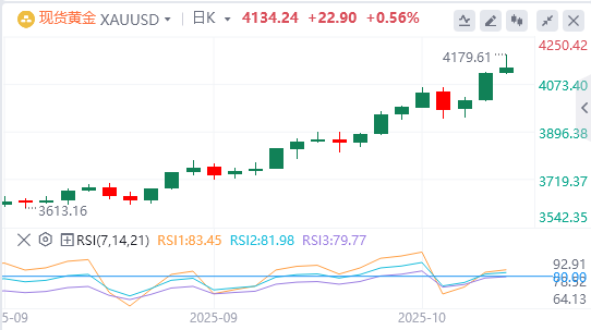 从技术角度来看,过去三周左右的近期上涨一直沿着向上倾斜的趋势线支撑。此外,隔夜突破4055-4060美元水平阻力位以及随后突破4100美元关口的强势再次证实了黄金/美元货币对的近期积极前景。然而,每日相对强弱指数(RSI)显示出极度超买的状况,在准备进一步升值之前需要谨慎行事。