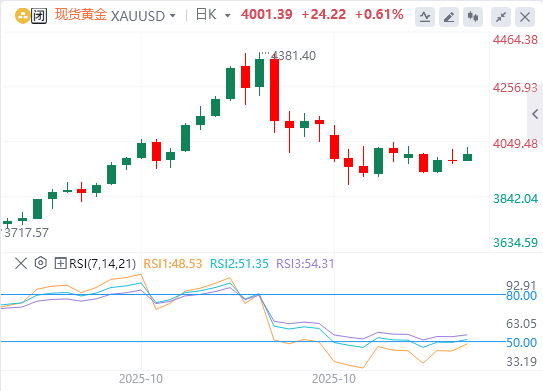 周四美国10月裁员超15万人(20年来同期新高),加剧衰退担忧,美元承压助黄金上行。周五密歇根消费者信心指数降至50.3,黄金维持4000美元附近。