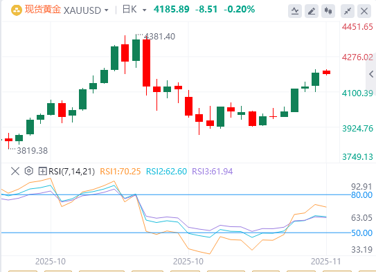 值得注意的是,虽然金价仍处高位,但10月以来的两周调整有效缓解了压力。10月份国际现货黄金的暴跌不再被视为泡沫破裂,而是投机者过快推高金价后的自然修正。许多投机者追高入场,一旦察觉风险便匆忙平仓,导致了回调。后续走势将取决于美国经济数据与美联储政策动向。