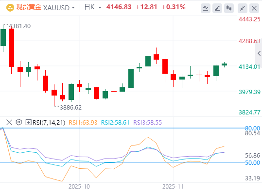 根据芝加哥商品交易所集团的FedWatch工具,12月期货市场隐含利率下调25个基点至3.50%至3.75%区间的概率现约为80%。这未能帮助美元在上周强劲上涨至数月高点的基础上继续走势,反而支持了无收益黄金。