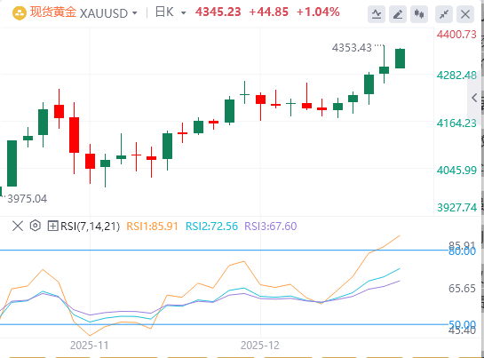 关键价位:上行方面,即时阻力关注4,345-4,355美元区间(布林带上轨及近期高点),突破后可能挑战历史高点4,381美元,进而上看4,400美元心理关口。下行方面,初步支撑位于4,257美元(12月12日低点),若跌破,可能进一步下探4,200美元(100日均线)及4,166美元(布林带下轨)。