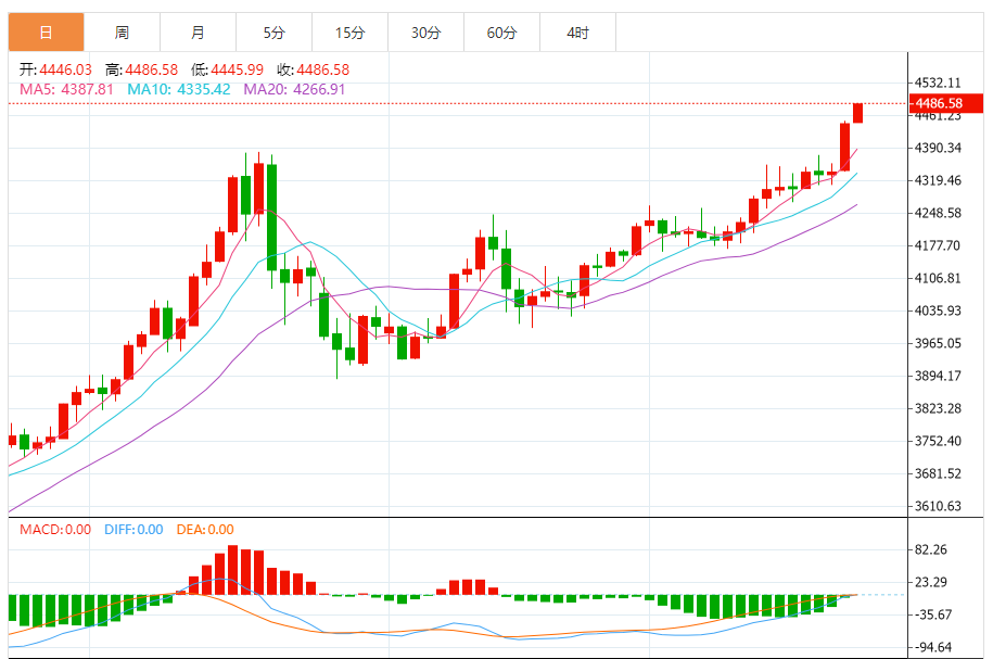 技术上,黄金价格上涨趋势依然完好,有望在短期内挑战4500美元/盎司大关。相对强弱指数(RSI)显示多头占据优势,RSI已进入超买区域,表明上涨势头强劲,预示着金价可能即将迎来一波上涨行情。如果金价突破4500美元/盎司,下一个阻力位将是4550美元/盎司和4600美元/盎司。