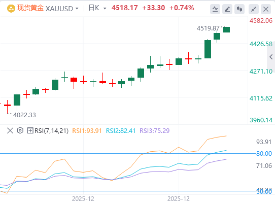 现货黄金延续创纪录的涨势,将历史新高刷新至4490美元上方,并一度逼近4500美元大关,截至目前,黄金报价4518.17。