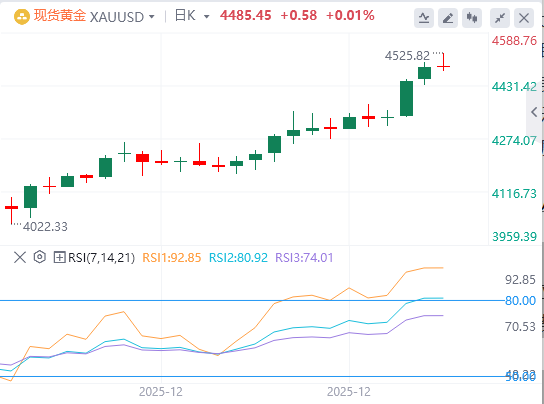 相对强弱指数(RSI)在日线图上显示极度超买的状态。这反过来又促使黄金出现一些获利了结,尤其是在本周初以来连续刷新历史新高之后。然而,更广泛的技术结构有利于看涨交易者,也支持部分下跌买盘出现的理由。