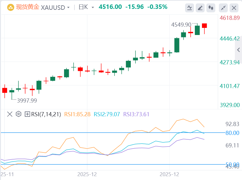 黄金短期震荡不改长期多头格局,日线图呈现"超买但趋势延续"特征。价格稳守100日EMA均线上方,布林带开口扩张预示上行空间犹存,但14日RSI指标超70进入超买区,提示需警惕回调风险。关键阻力位4550美元若被突破,可能挑战4600美元心理关口;支撑方面,12月23日扩张低点4430美元为初步防线,跌破则下看4338-4300美元支撑区。当前技术面呈现"突破-消化-再突破"的震荡上行模式,需关注RSI指标是否形成顶背离及4550美元阻力位突破情况。
