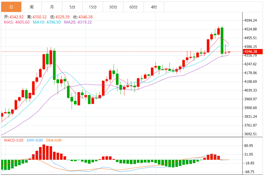 日线级别呈现高位震荡整理形态。前期金价突破10月前高4425美元/盎司后出现回调,当前在4300-4400美元区间形成震荡中枢,5日均线与10日均线呈金叉向上排列,分别位于4340美元/盎司、4320美元/盎司,为短期走势提供支撑。MACD指标显示,红柱动能较前期有所缩减,但仍处于零轴上方,表明多头趋势未被破坏,只是上涨动能有所衰减。RSI相对强弱指数报62,尚未进入超买区间(70以上),仍存在一定上行空间,但需警惕高位背离风险。
