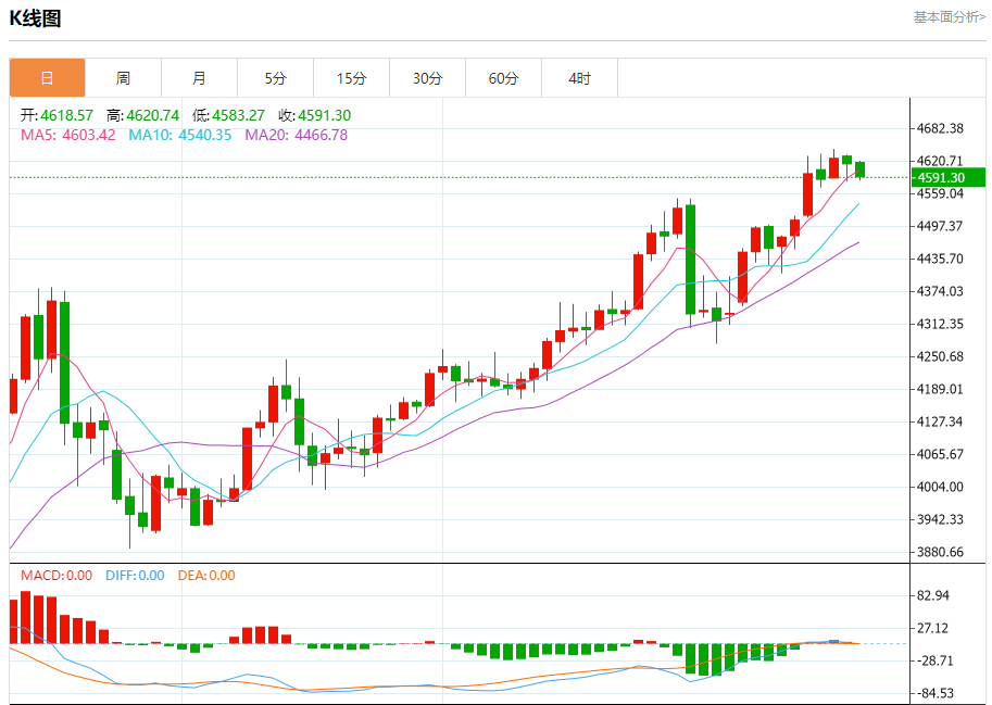 四小时级别:10日均线与布林带中轨在4590美元附近形成共振支撑,早间探底4591后迅速反弹,显示买盘承接力较强
