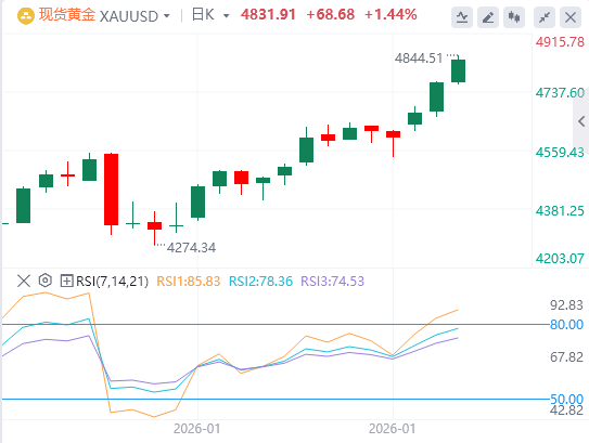 周二,特朗普威胁要对欧洲盟友征收额外关税,引发对避险资产的抢购,国际现货黄金首次突破4760美元,截至目前,黄金报价4831.91。