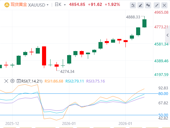 最新的上涨确认了本月迄今上升通道顶部的新一轮多头突破。随后突破4800美元大关的强势支持了建设性前景,支持了这一稳固上升趋势的延续。移动平均线收敛背离线(MACD)延伸至信号线之上,两者均高于零,反映多头动能增强;正直方图变宽,强化了积极的音调。