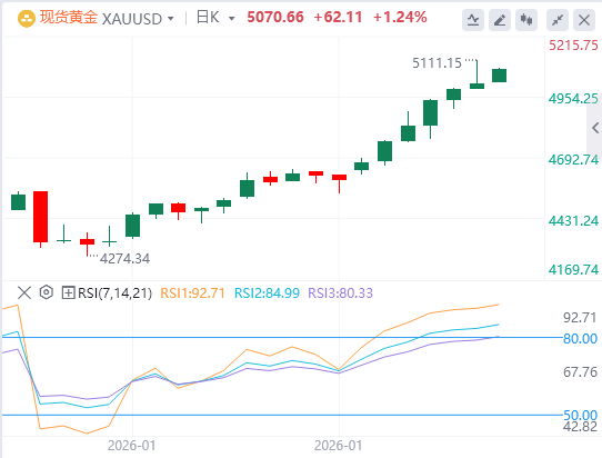 由于美元疲软增强了需求,贵金属价格再创新高,但随后剧烈波动回落。现货黄金盘中突破5100美元/盎司,美盘午后震荡走低跌破5000美元关口,截至目前,黄金报价5070.66。