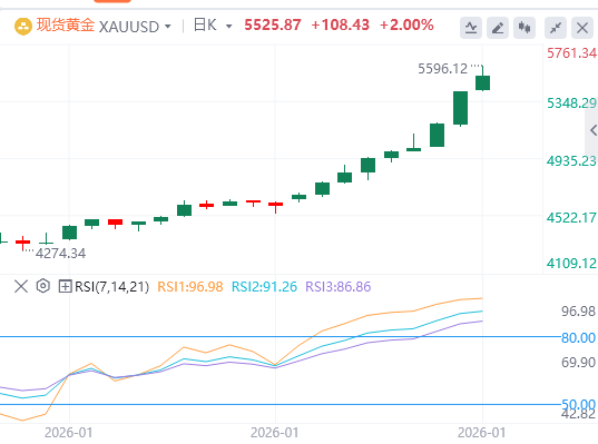 1月29日,周四亚市早盘,黄金上涨至创历史新高5596美元,随后回落至约5525美元。黄金的反弹得益于在持续地缘政治紧张、经济不确定性和美元走弱的背景下,避险需求强劲。