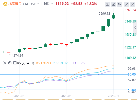 国际现货黄金在周四开盘后飙升至5596美元的历史新高,随后回落近100美元,目前围绕5500关口上下波动。在持续的地缘政治紧张局势、经济不确定性以及美元走弱的背景下,强劲的避险需求正持续推动市场对贵金属的需求,从而支撑其价格不断刷新历史。