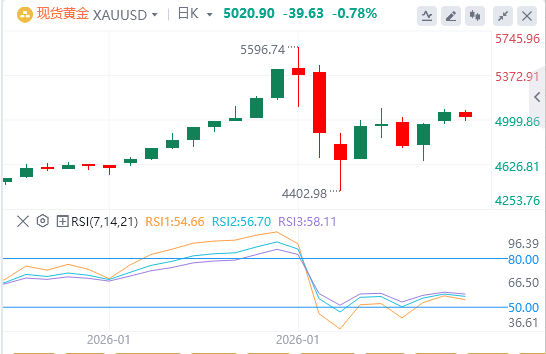 尽管此前金价遭遇了21%的回撤,一度跌至4400美元,但目前已成功重返5000美元/盎司这一具有强大心理支撑的关口。事实证明,此轮回调只是昙花一现。随着买盘强势介入,金价在不到48小时内实现了超过17%的惊人反弹。