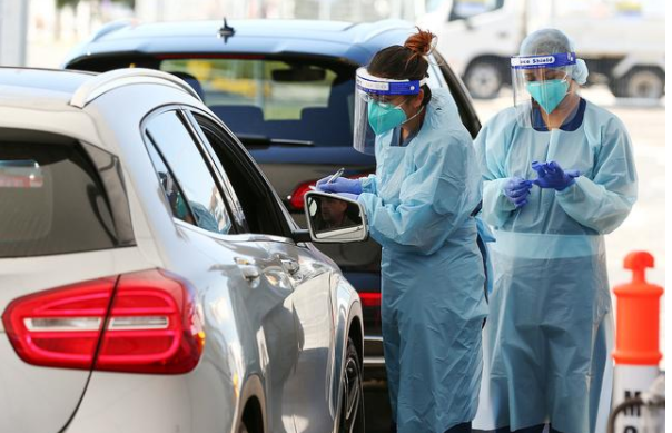 当地时间2020年8月31日,澳大利亚悉尼瑞西卡特湾与邦迪(Bondi)郊区设立新冠检测点, 身穿个人防护设备(PPE)的医护人员为民众进行新冠状病毒检测。自维多利亚州新冠疫情爆发后,澳洲东海岸民众担忧加深。