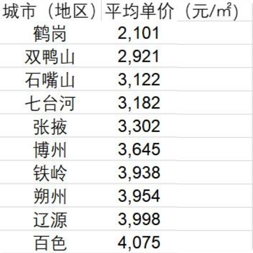 第一财经记者梳理了中国房价行情平台上各城市2月二手住宅平均单价数据后发现,当前,房价最低的10个城市,分别是:鹤岗、双鸭山、石嘴山、七台河、张掖、博州、铁岭、朔州、辽源、百色。