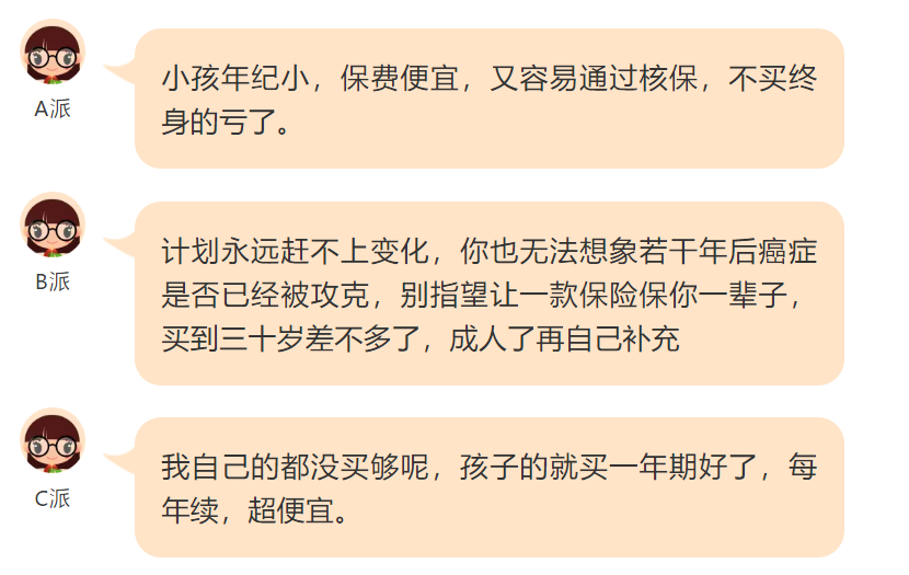 意外险和医疗险都是交一年保一年的消费型保险,无可争议;关于儿童重疾险的保障期间,分为好几派: